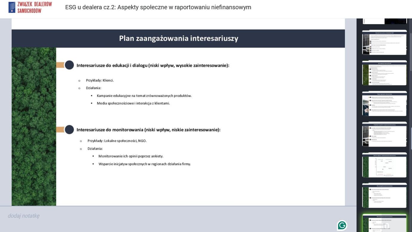 30 stycznia 2025 roku odbyła się kolejna część szkolenia z cyklu „ESG u dealera”. Podczas spotkania poświęconego aspektom społecznym w raportowaniu niefinansowym mecenas Marta Rabe-Kozłowska przybliżyła państwu temat kluczowych elementów raportowania w zakresie social, metodologię zbierania danych od interesariuszy oraz kwestie związane z łańcuchem wartości organizacji od strony własnych pracowników.